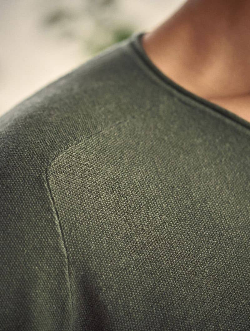 Confeccionado en 55% cáñamo y 45% algodón orgánico, es ligero, transpirable y agradable al tacto. El tejido slub le aporta una textura sutil y un acabado natural.