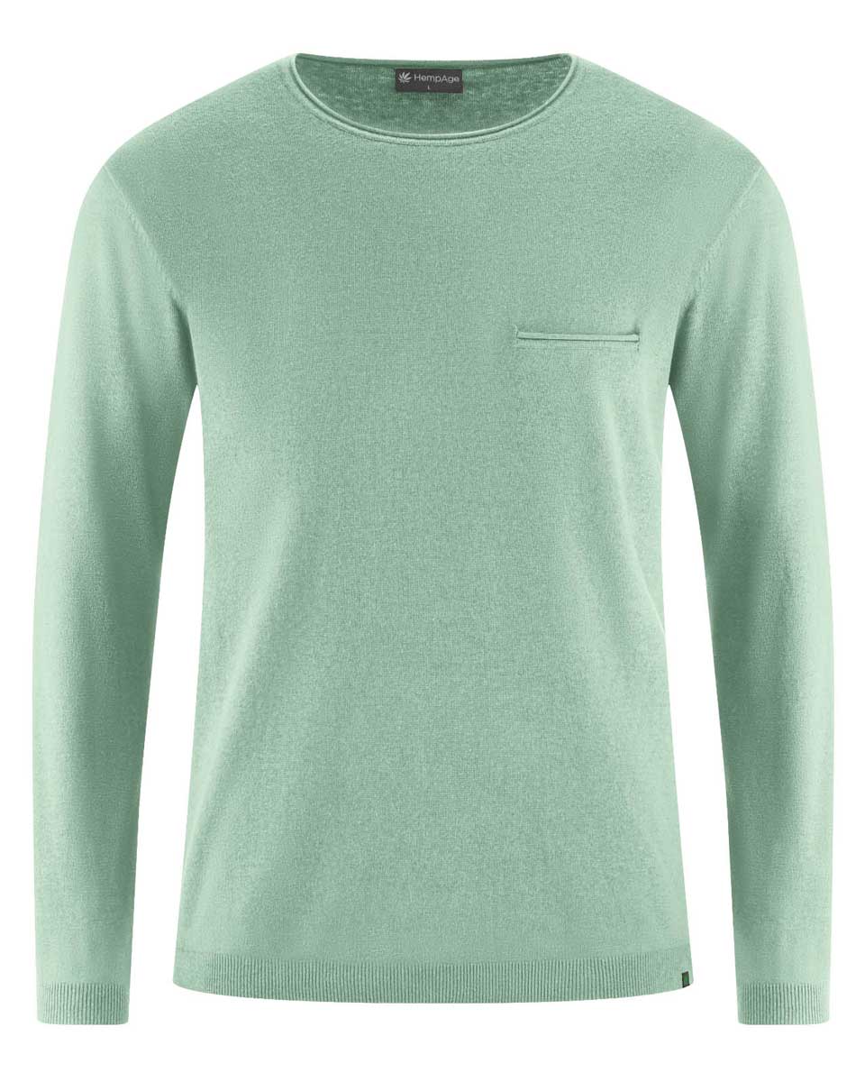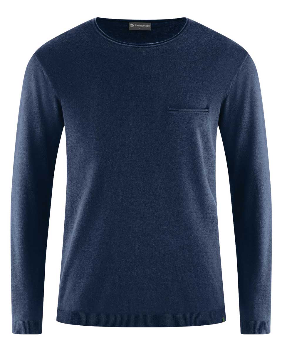 Este suéter de punto fino para hombre presenta corte recto, cuello redondo y un bolsillo en el pecho.