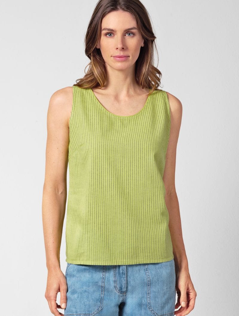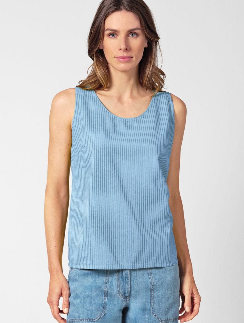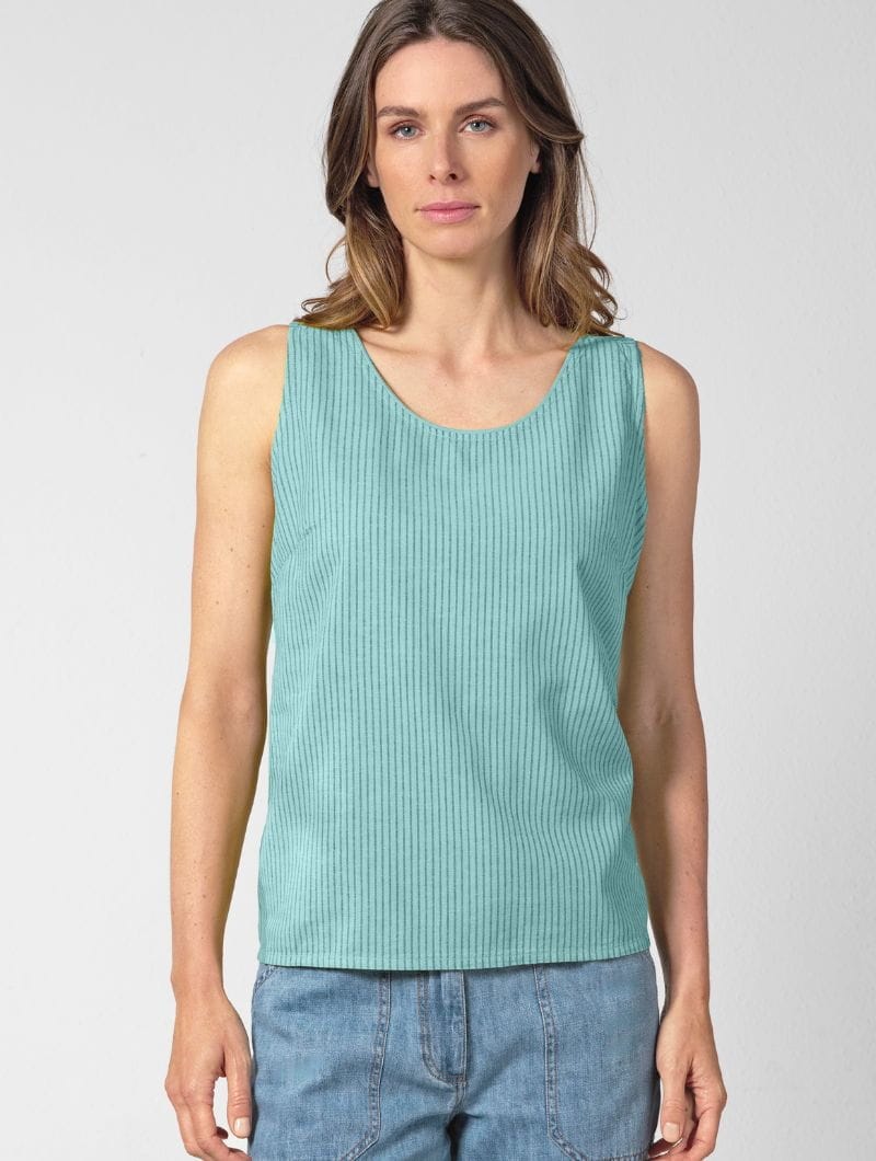 Su diseño sin mangas, con escote en contraste y pinzas en el pecho, ofrece un ajuste cómodo y favorecedor. Las finas rayas verticales estilizan la silueta, mientras que la inserción horizontal en los hombros aporta un toque original.