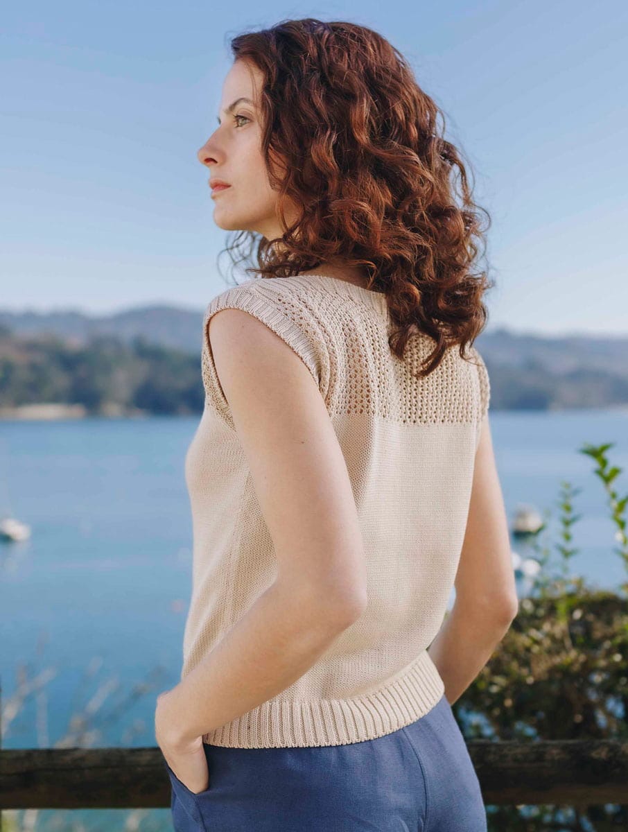 El top de punto calado en color arena de ROADE es la mezcla perfecta de estilo y sostenibilidad.