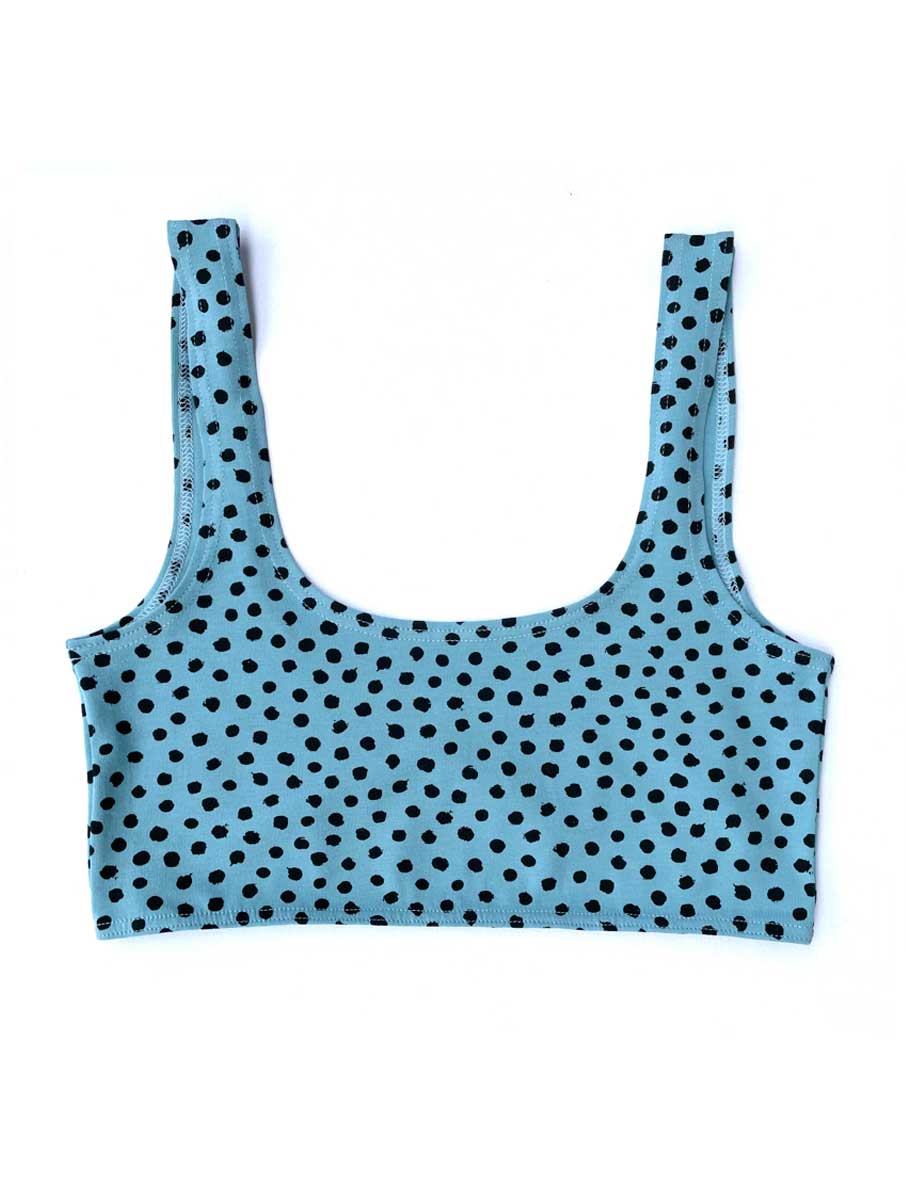 Top sujetador algodón orgánico azul con estampado de lunares negros.
