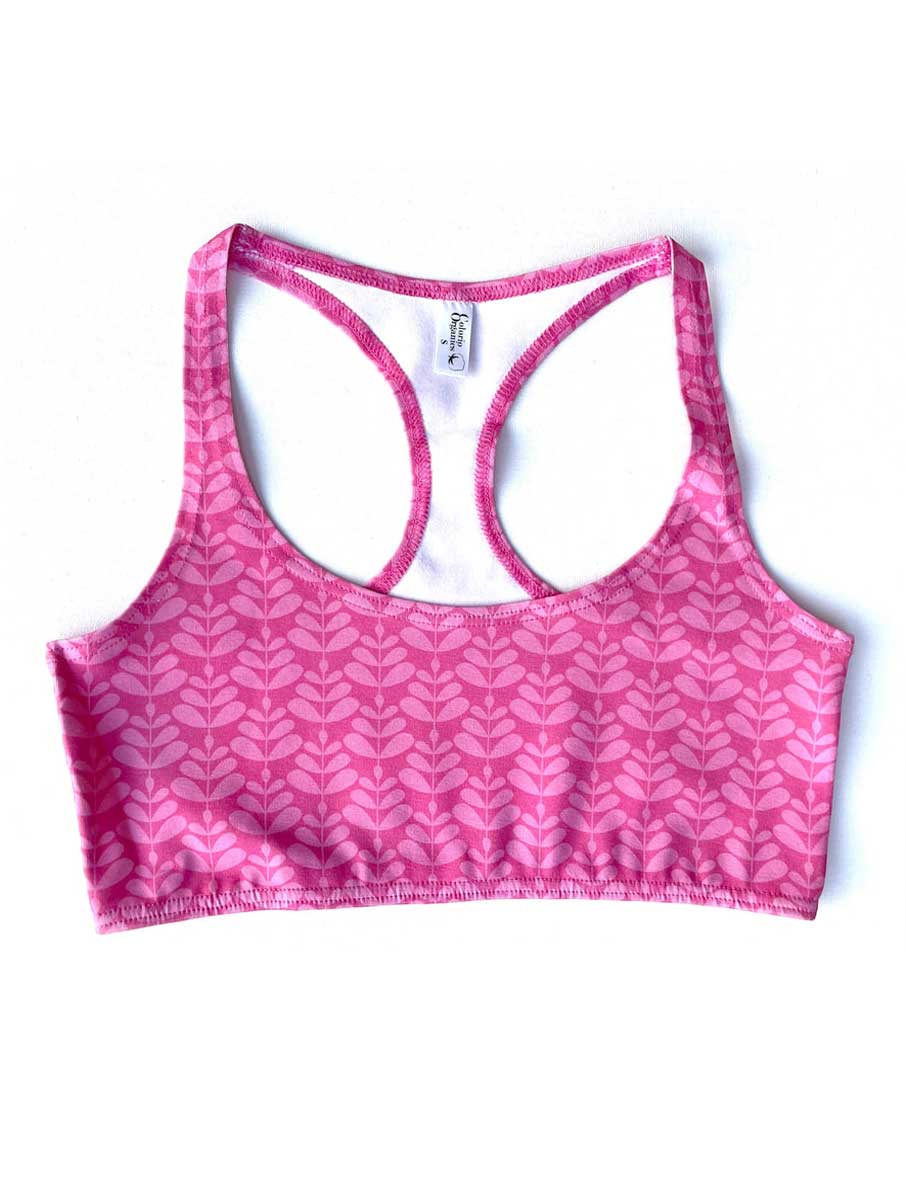 Top sujetador de algodón orgánico magenta con estampado de hojas retro.