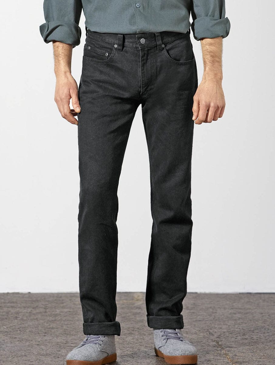 Los vaqueros negro hombre son ecológicos y están fabricados en una mezcla de cáñamo y algodón orgánico con certificados Organic Content Standard y OEKO-TEX® Standard 100.