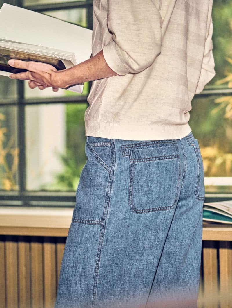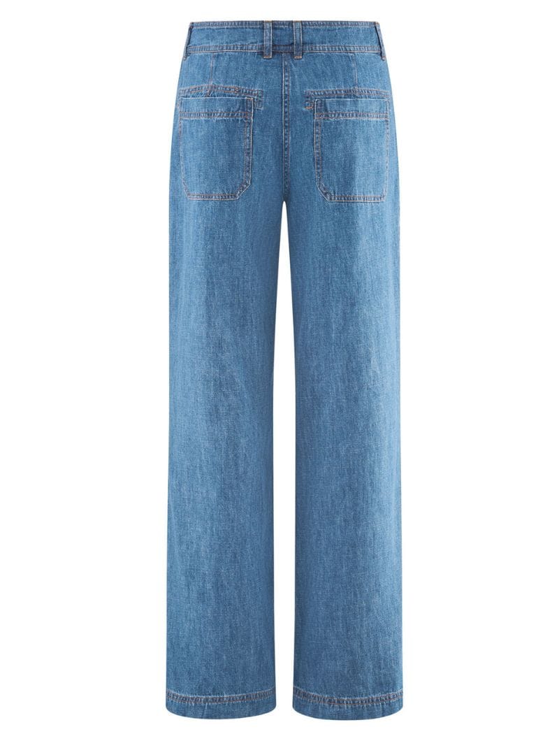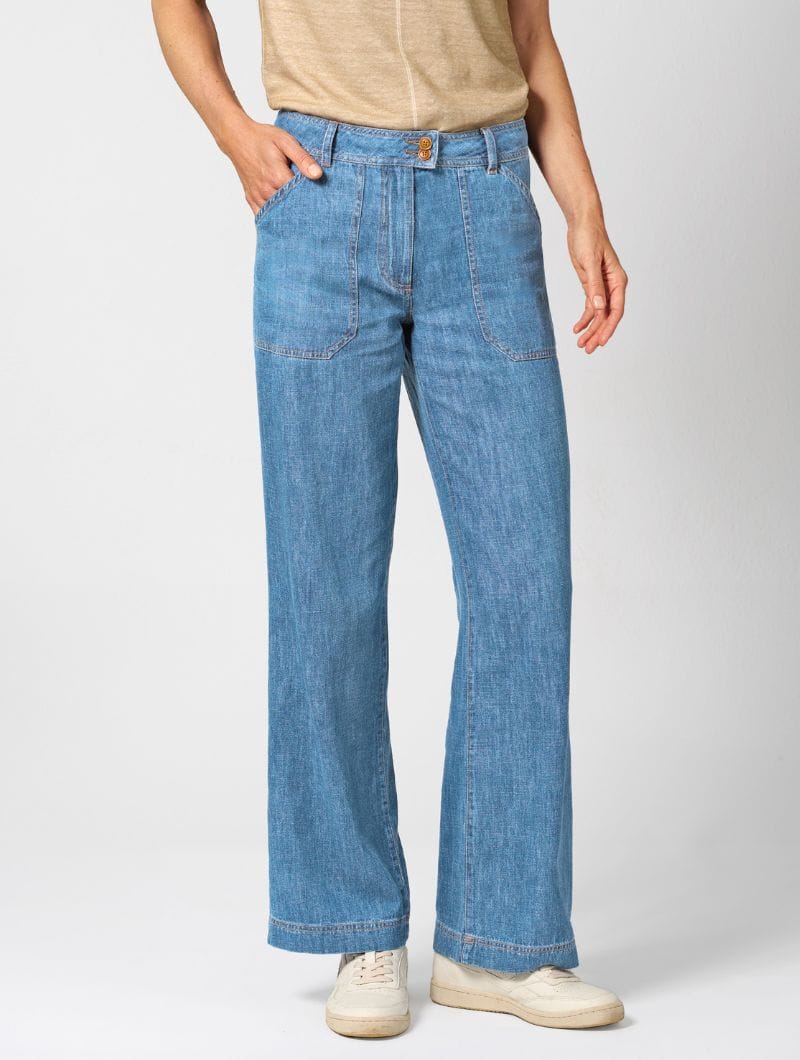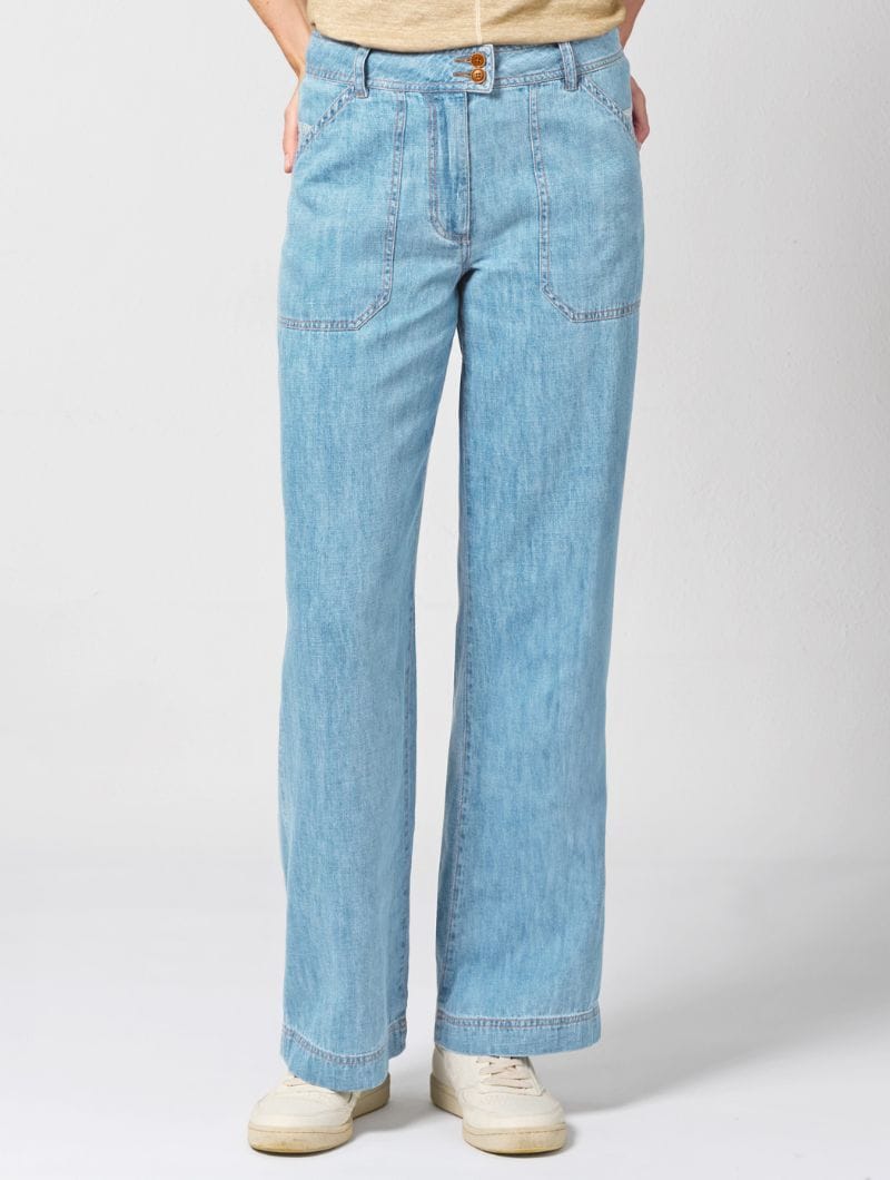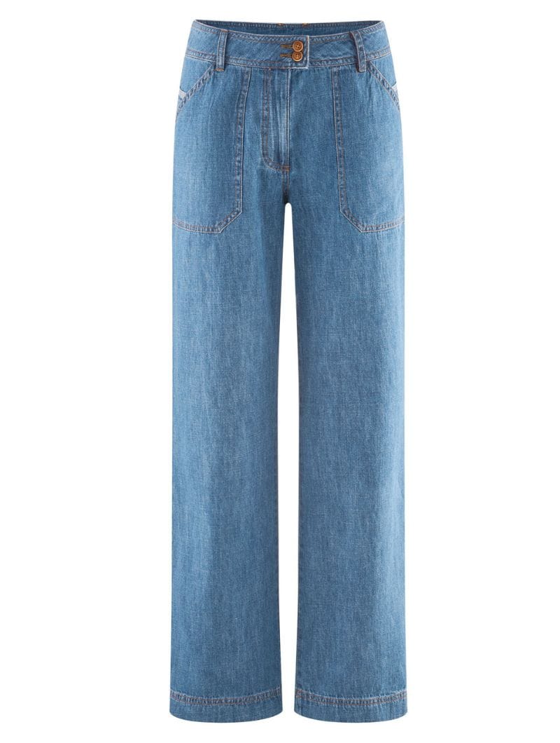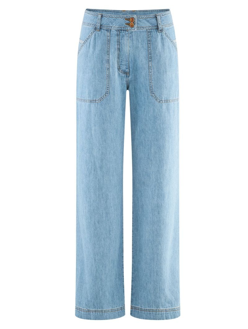 Confeccionados en un denim ecológico de 55% cáñamo y 45% algodón, destacan por su resistencia, transpirabilidad y tacto suave. Los bolsillos de parche delanteros y traseros, las costuras en contraste y los botones de corozo marrón ámbar aportan un acabado auténtico.