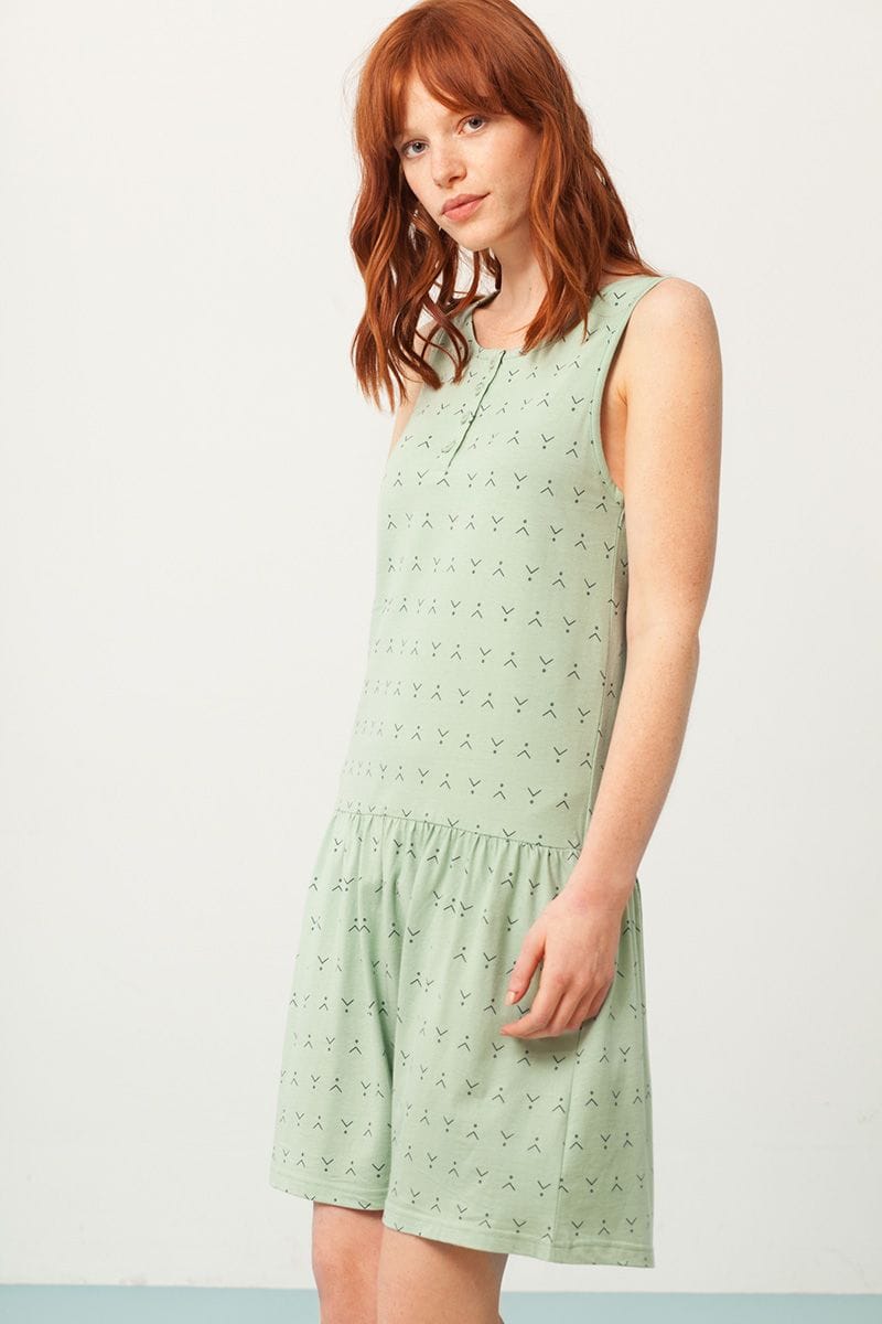 Vestido charlestón verde menta con estampado abstracto.