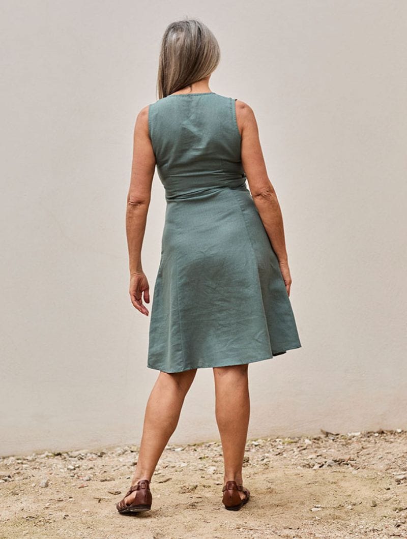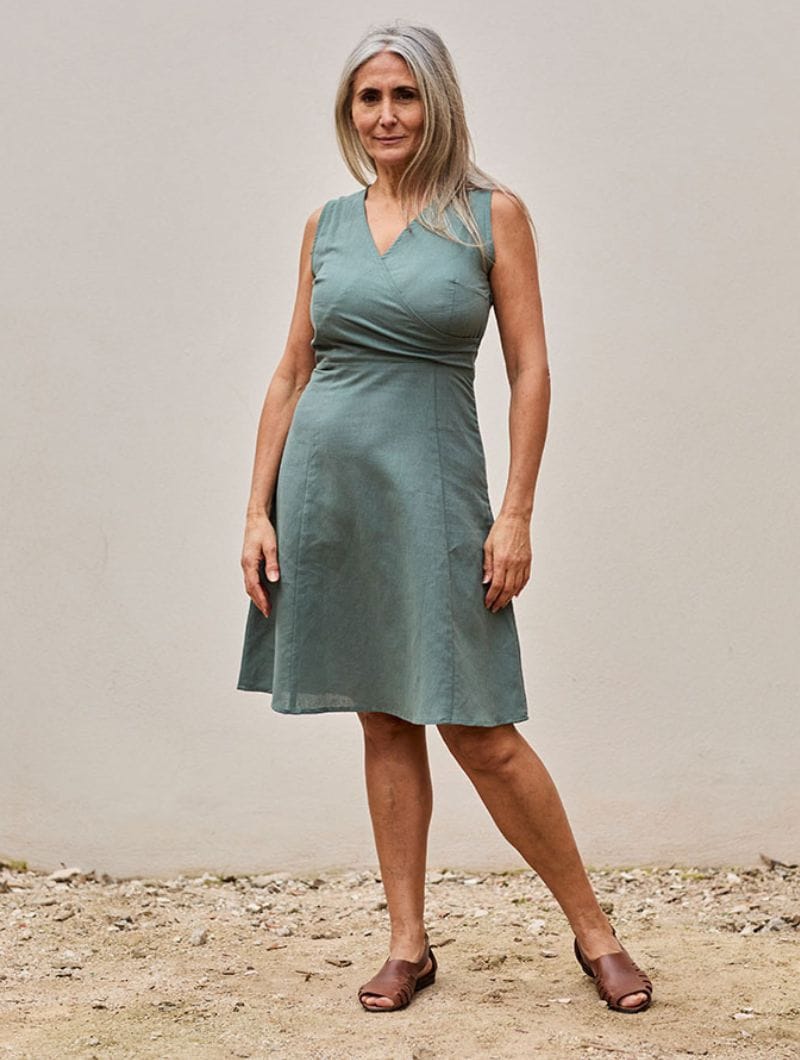 Diseñado en España y hecho éticamente en India, el vestido cruzado de lino y algodón orgánico es una muestra de compromiso con la moda sostenible.
