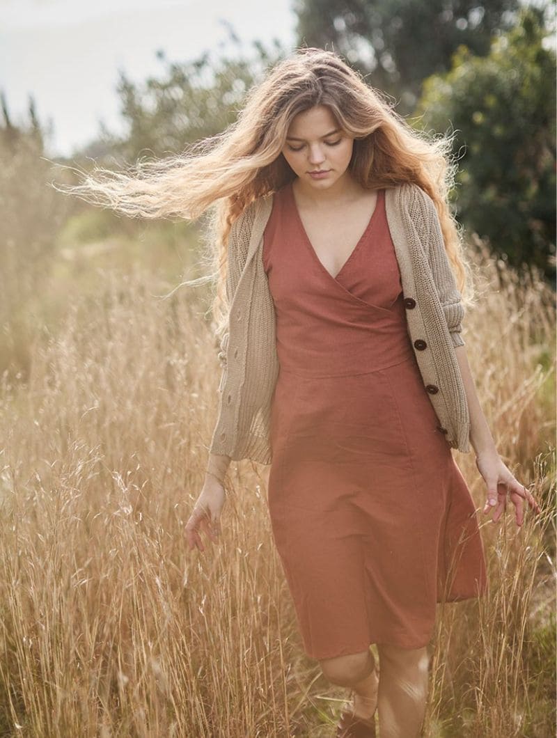 El vestido cruzado de lino y algodón orgánico es la prenda perfecta para disfrutar del sol, la brisa y la libertad.