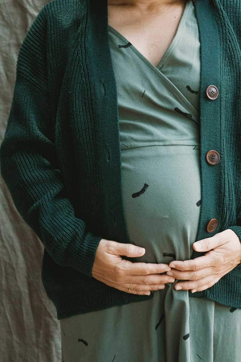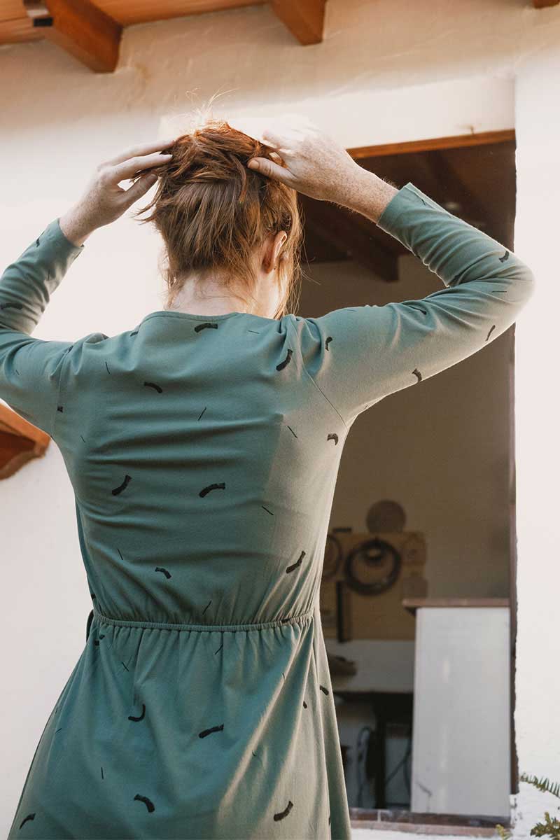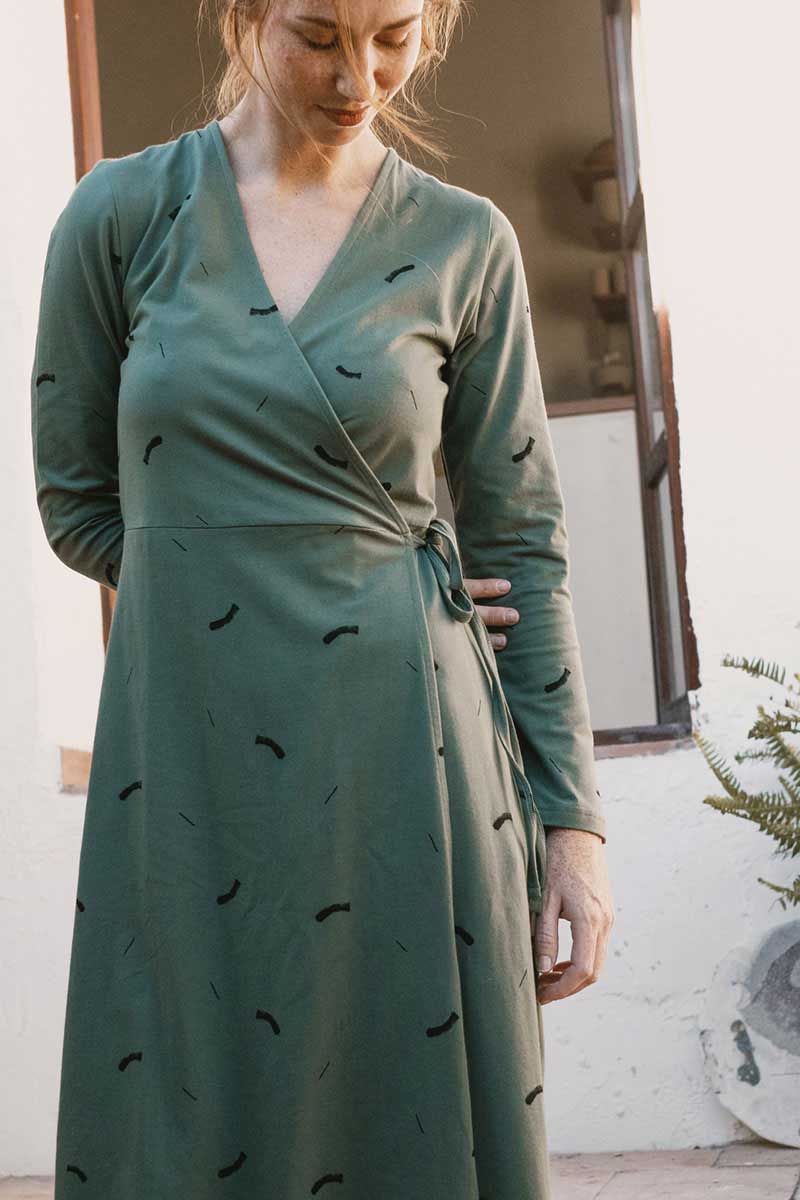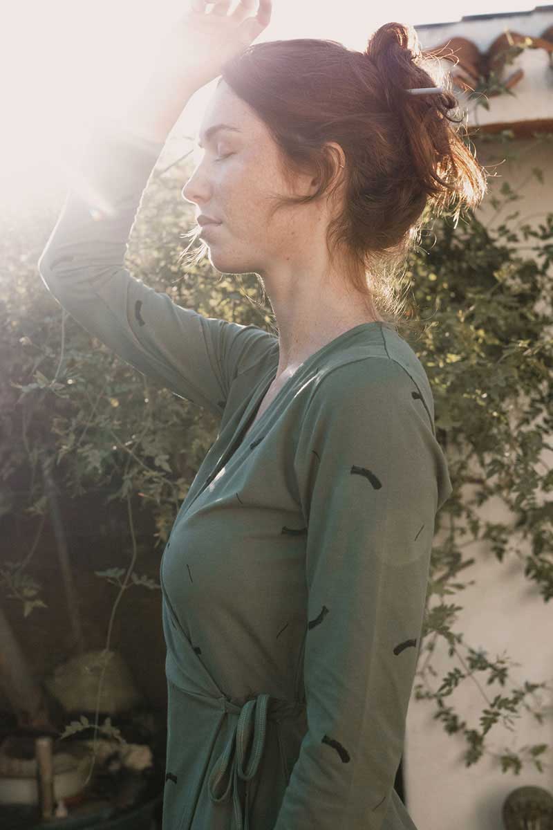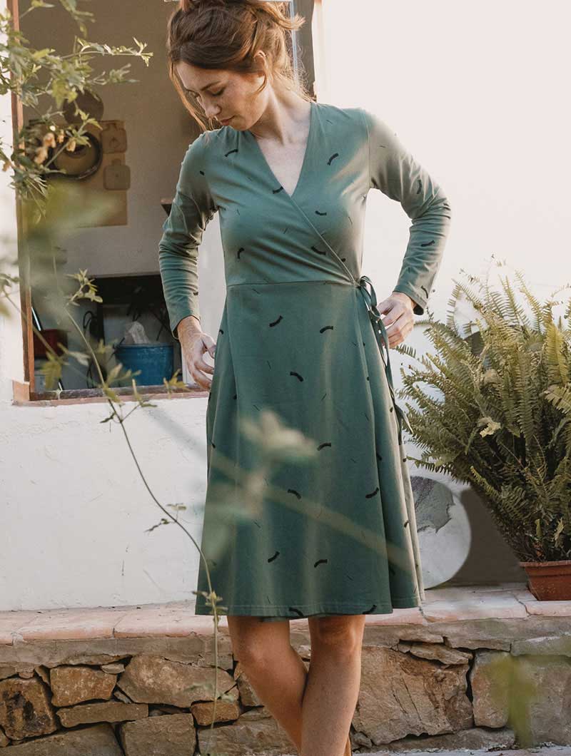 El vestido cruzado de manga larga verde está confeccionado con 95% algodón ecológico con certificado GOTS, 5% elastano y tintes al agua respetuosos con el medio ambiente.