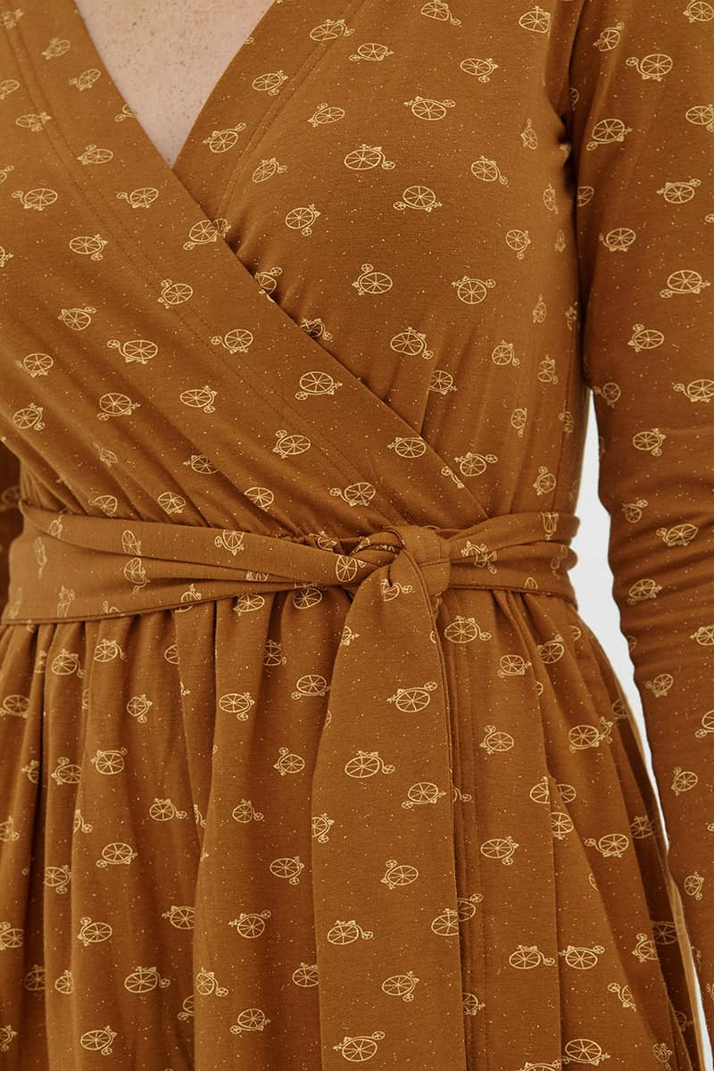 Vestido cruzado marrón con estampado de bicicletas.