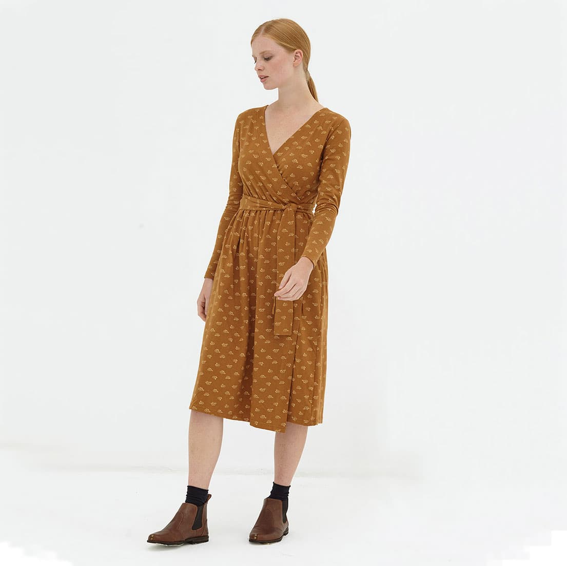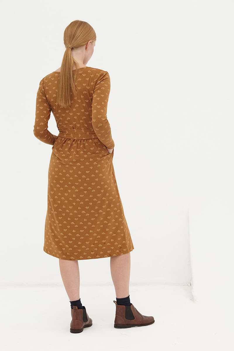 El vestido cruzado marrón está confeccionado con algodón orgánico certificado GOTS y tintes de bajo impacto ambiental.