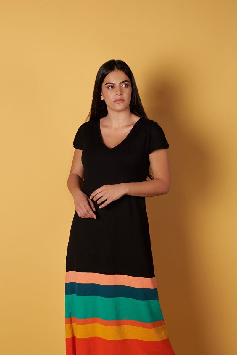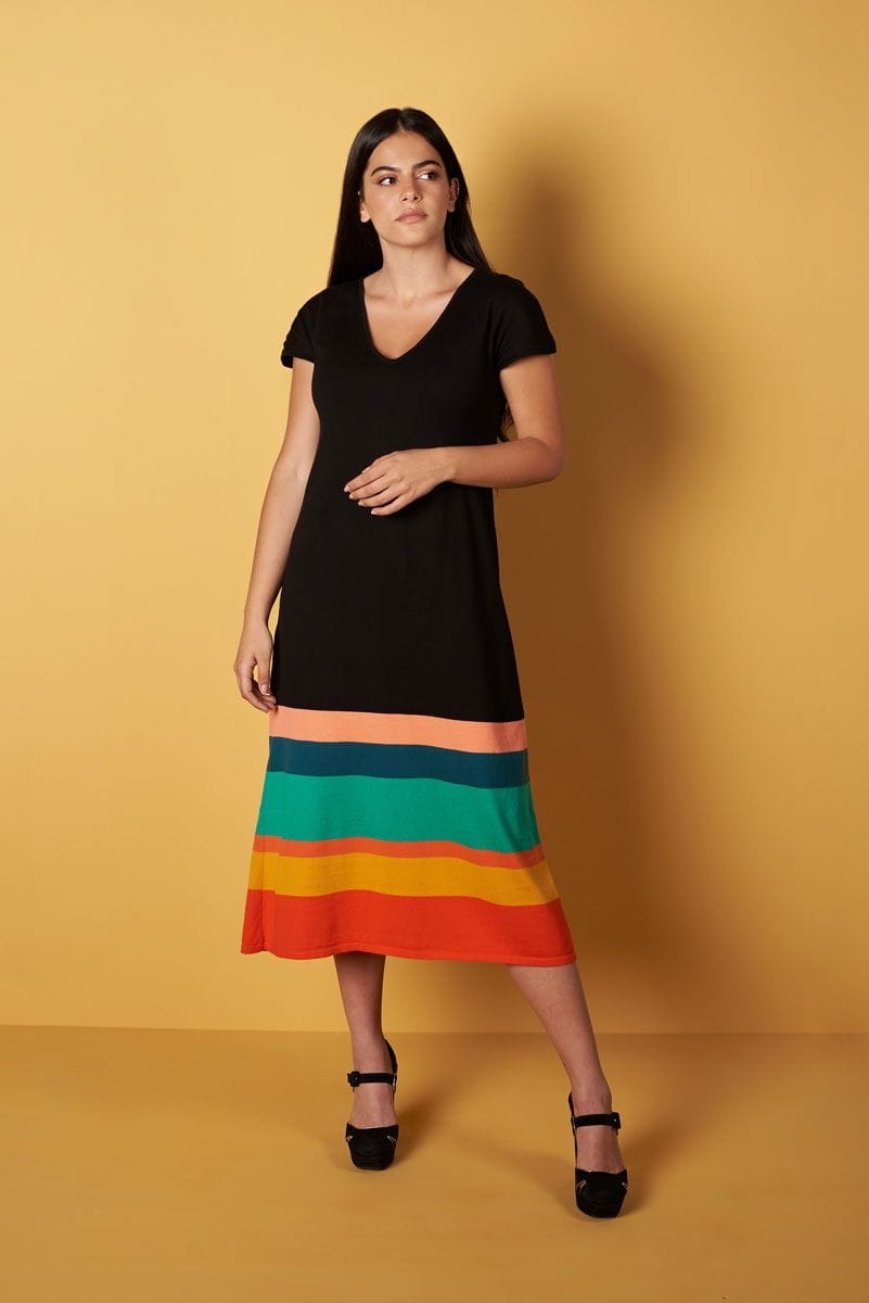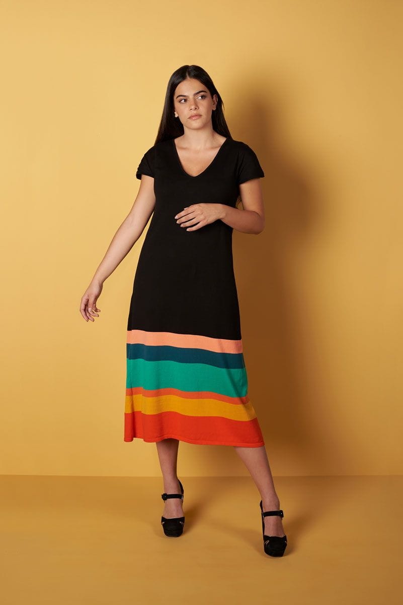 Vestido de punto negro con rayas de colores.