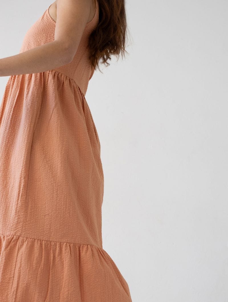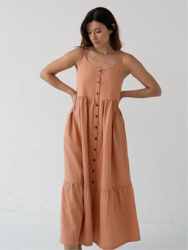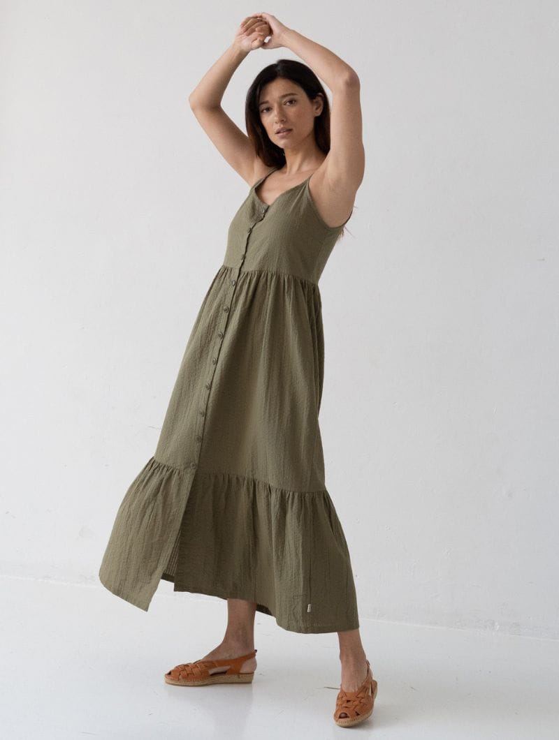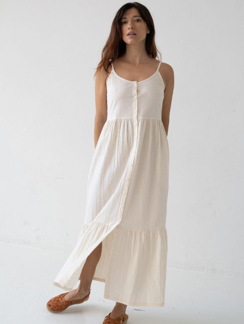 Vestido largo de corte cómodo con botonadura frontal y bolsillos laterales. Fresco y ligero, ideal para el verano.