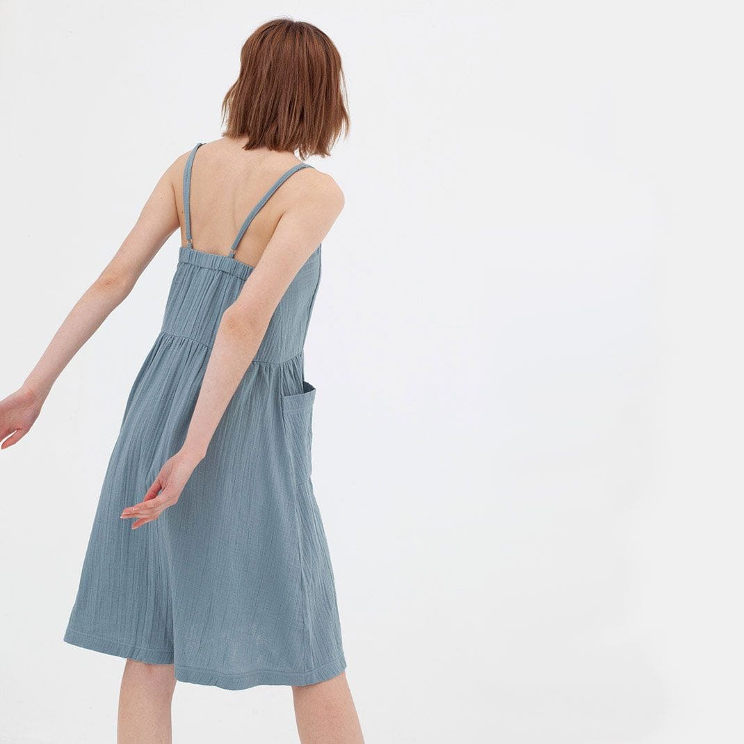 Vestido midi azul de algodón orgánico con tirantes ajustables y botones de coco.
