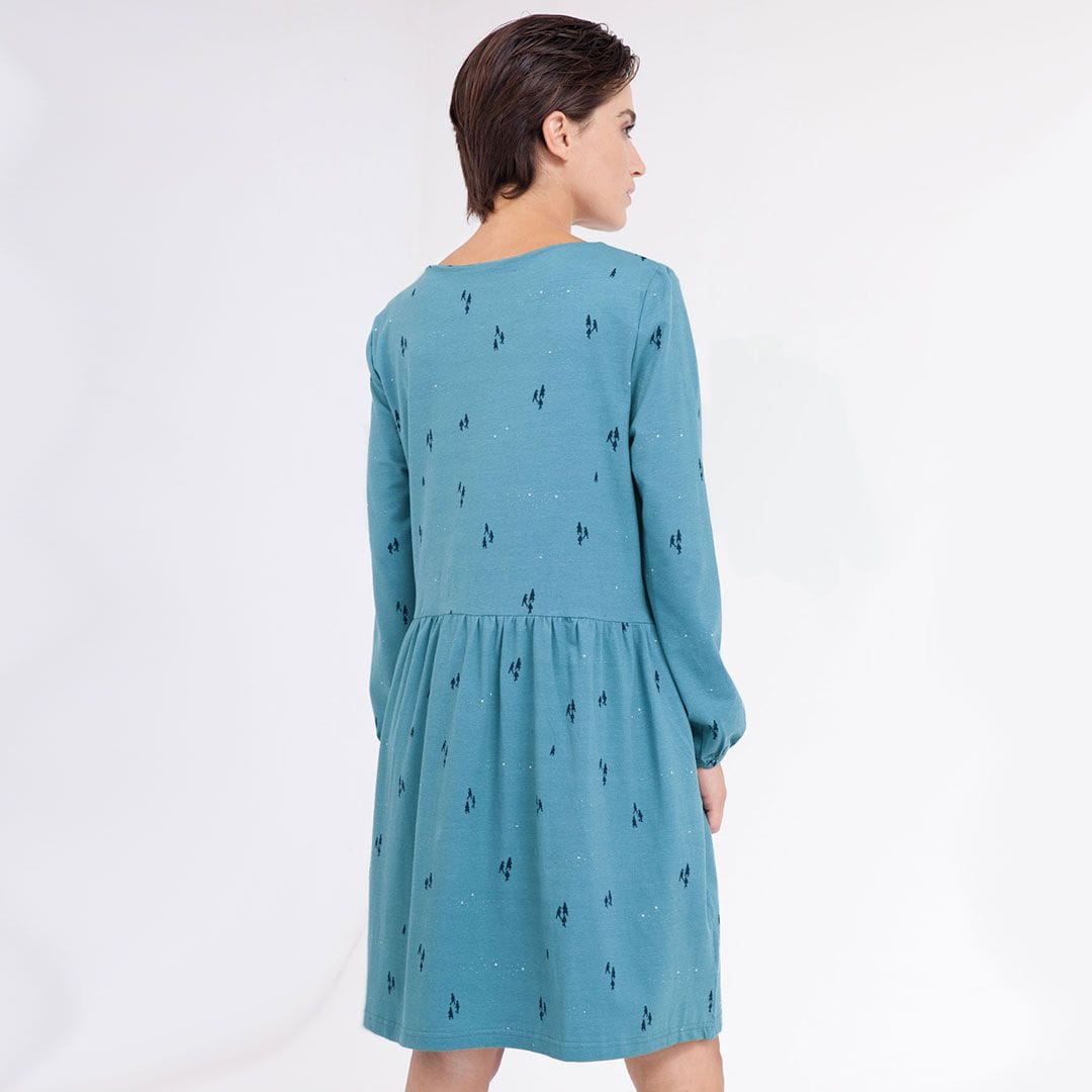 El vestido oversize azul ópalo está confeccionado en algodón orgánico con certificado GOTS y tintes ecológicos.