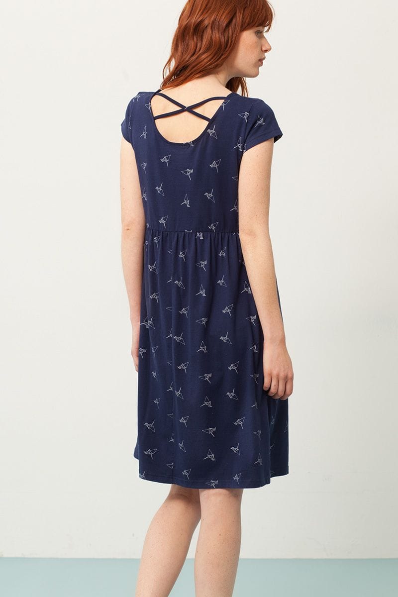 Práctico vestido para mujer con espalda cruzada y tapeta con botones forrados.