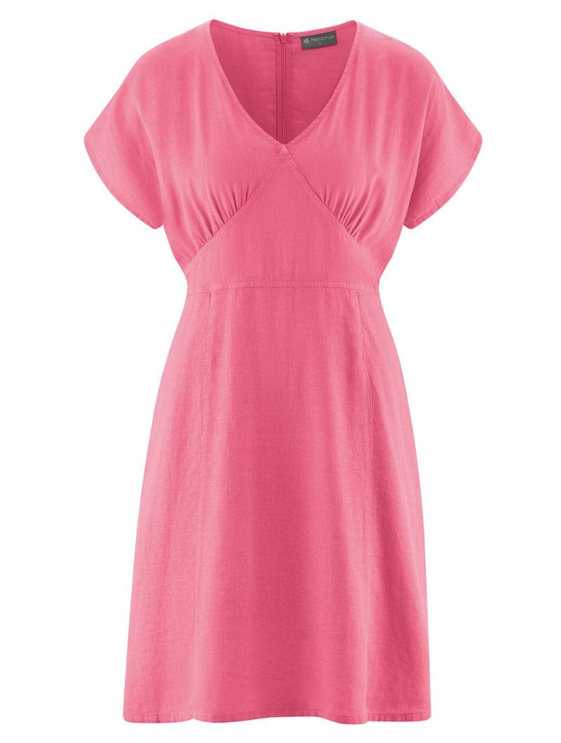 Vestido rosa con elegante y original fruncido en la parte del pecho.